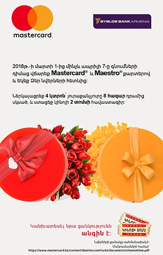 2018թ. մարտի 1-ից ապրիլի 7-ը կատարեք առնվազն 8000 ՀՀ դրամի 4 գնումներ Բիբլոս Բանկ Արմենիայի MasterCard և/կամ Maestro քարտերով և կտրոնների դիմաց ստացեք կինոյի 2 տոմսեր: