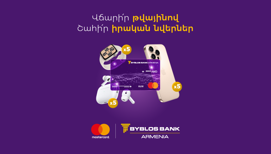 Բիբլոս Բանկ Արմենիան, Mastercard-ի հետ համատեղ, մեկնարկել է նոր արշավ, որի շրջանակում խաղարկվում է 5-ական iPhone 16 Pro, Apple Watch SE (2-րդ սերնդի) և AirPods Pro 2։